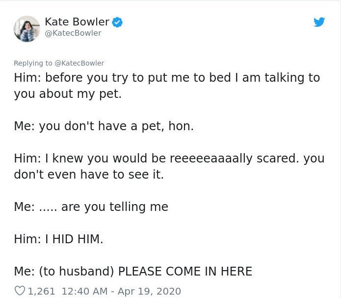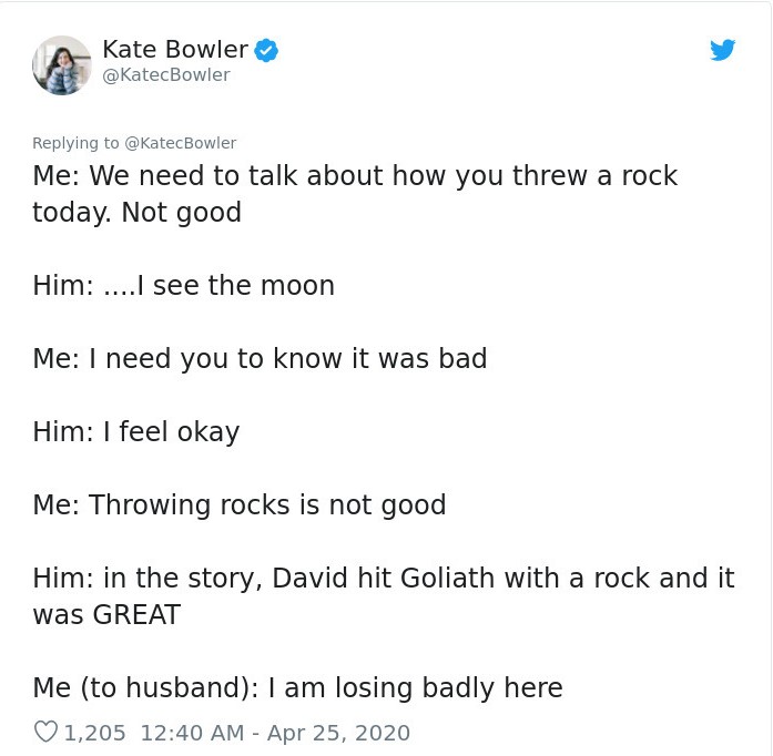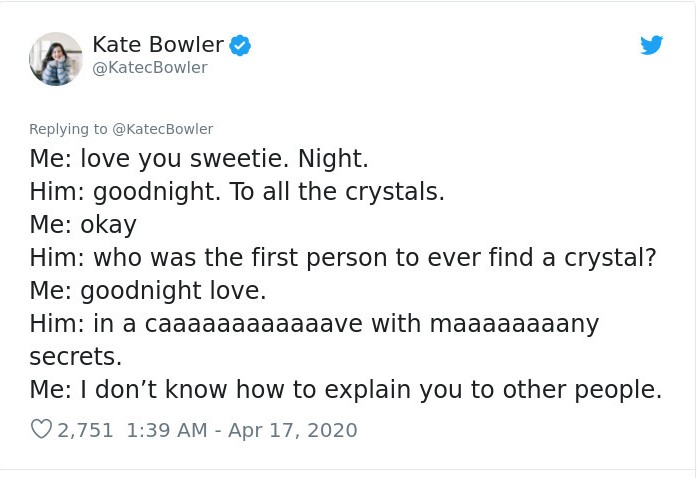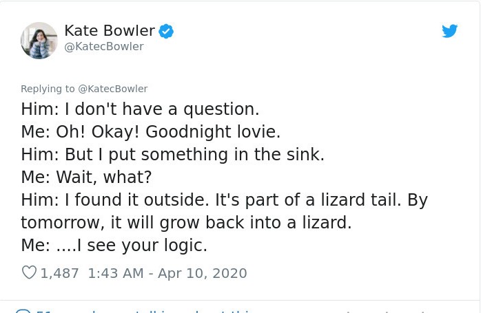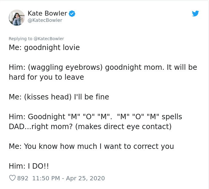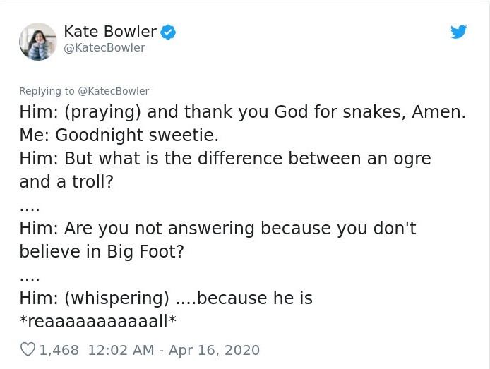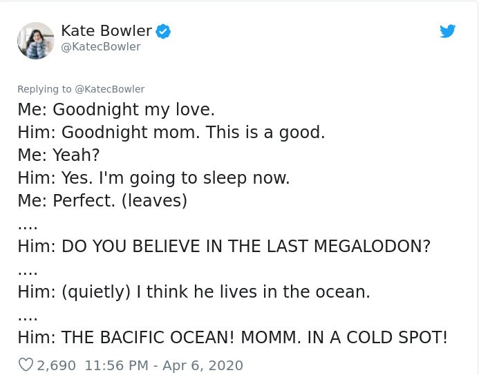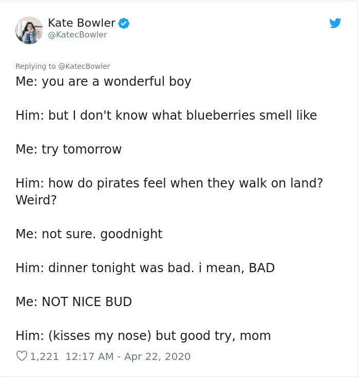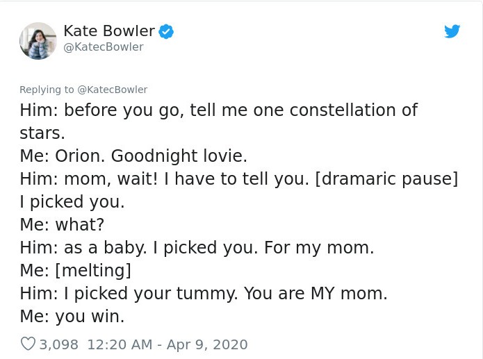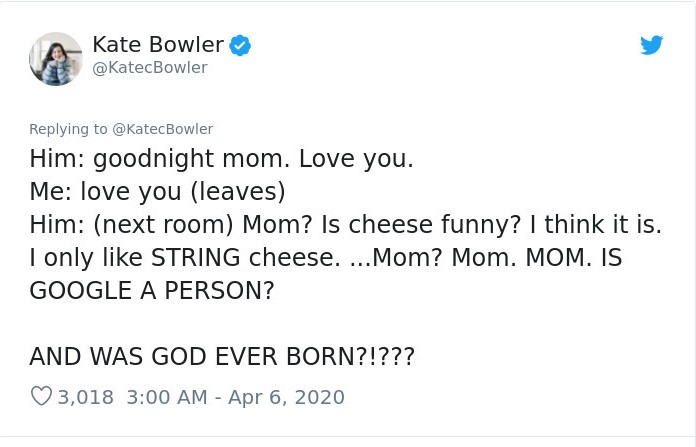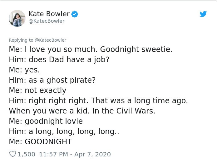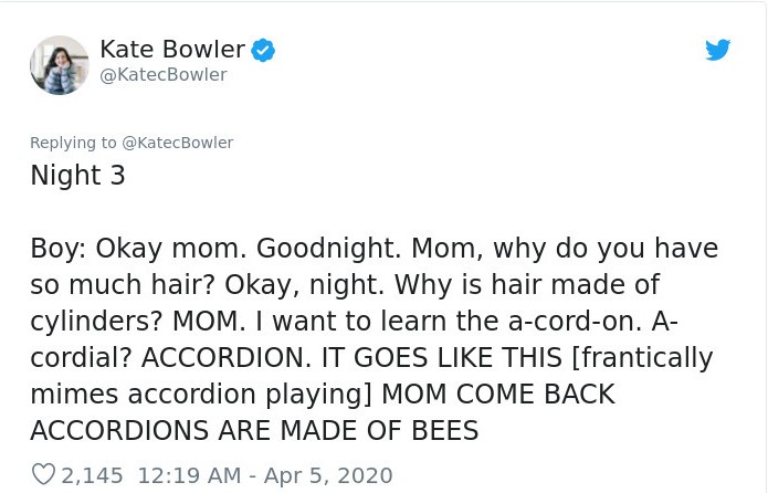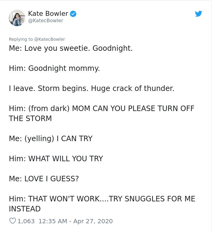 Kate Bowler’s son says interesting stuff to keep his mom in his room before going to sleep. That’s why she decided to write everything down and shared it on social media.