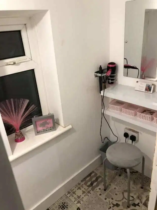 The mom along with her husband prepared the beauty station with the help of DIY. They stripped the walls, laid a new floor, gave it new paint and added new furniture and accessories.