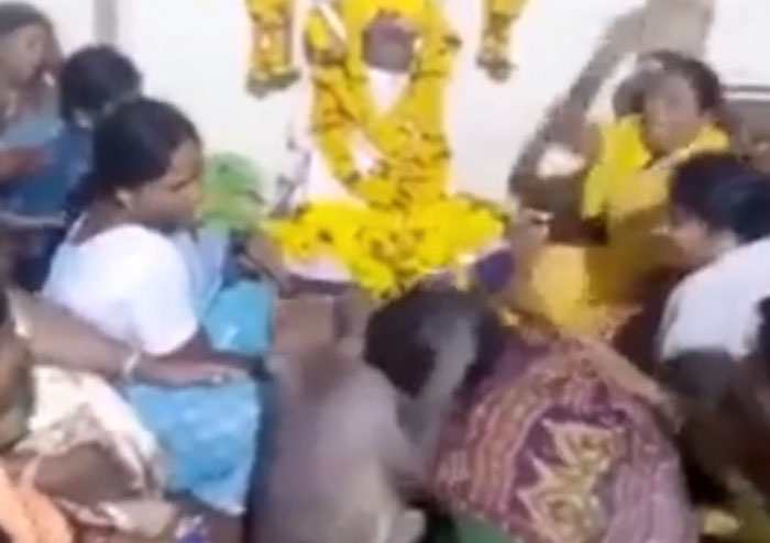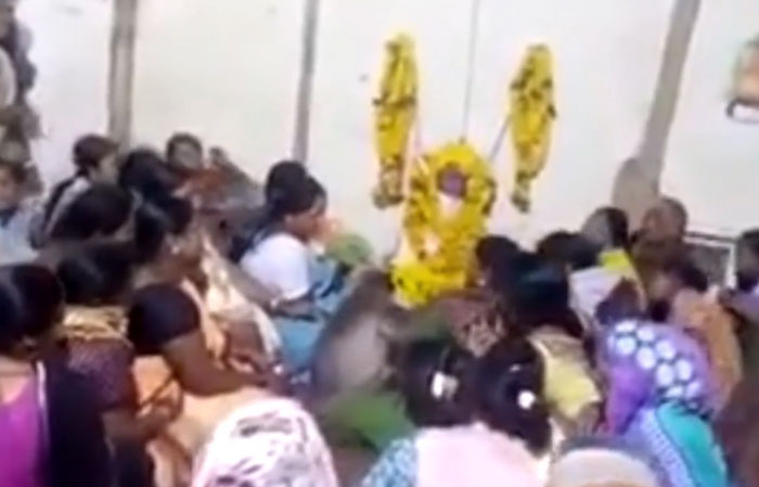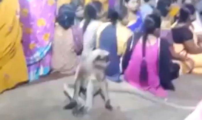 Grieving women were sitting on the floor during the funeral of 80-year-old Devendrappa Kammar, of Nargund, southern India when a monkey joined them.