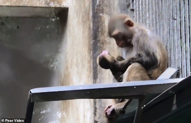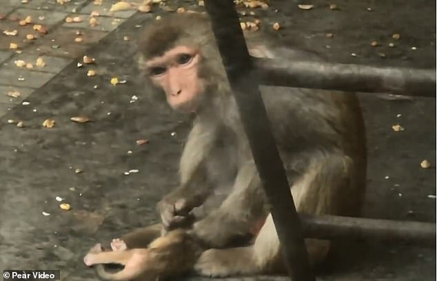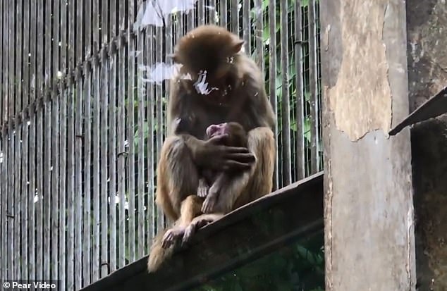The mother monkey can be seen cradling and kissing her dead baby in an enclosure at the Xiangyang Zoo in Hubei province.