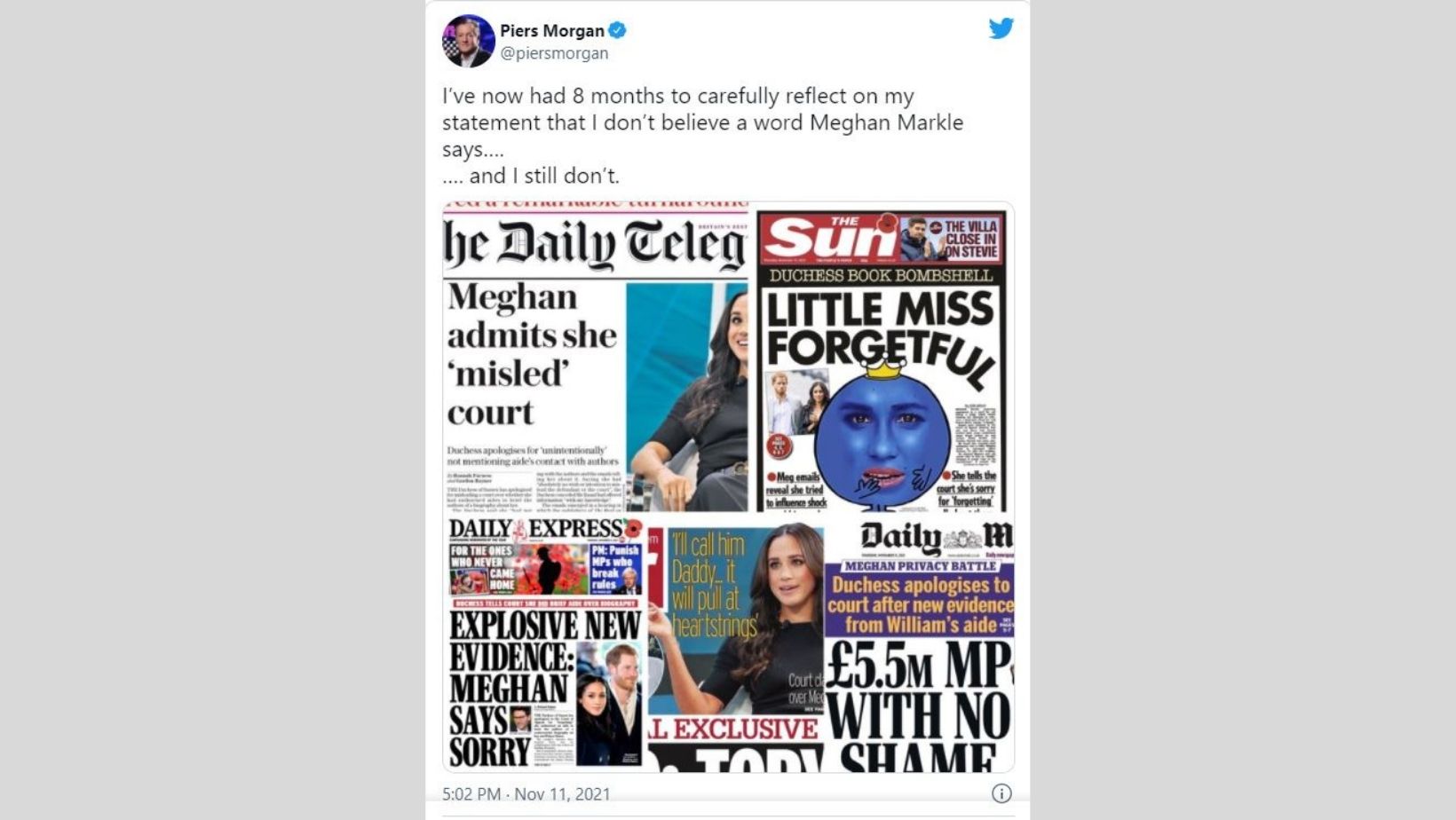 Piers Morgan, 56, has taken to Twitter to insist that he “still” doesn’t believe what Meghan Markle says. The presenter shared several newspaper clippings from today addressing reports that Meghan has now apologized for “misleading” the courts.