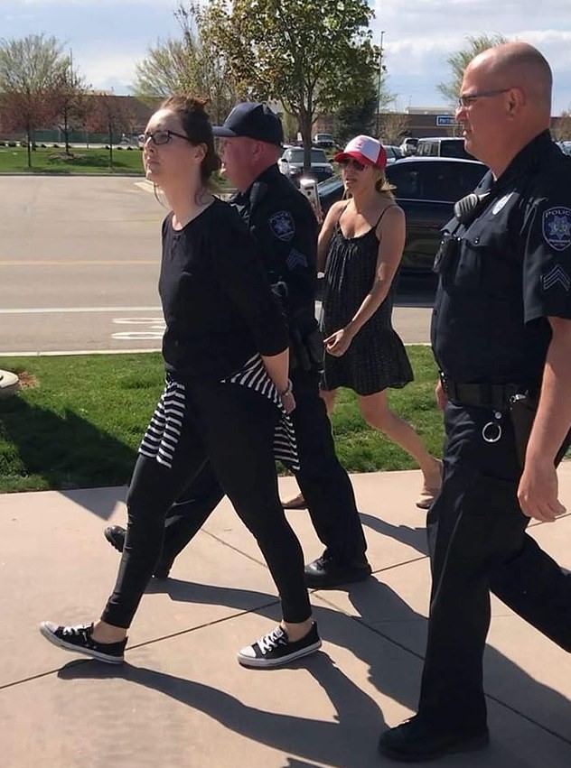 After the mum refused to leave, the officers gave her five seconds before handcuffing her and taking her to the police station for trespassing. Later the same day, she was released and able to join another mass protest in Idaho.
