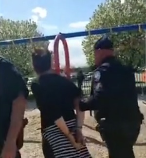 A mother was handcuffed and arrested after protesting against lockdown orders by taking her children to a closed playground.