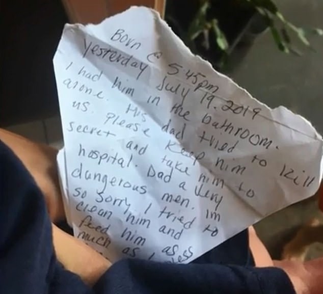 “Born at 5.45pm yesterday, July 19, 2019. I had him in the bathroom alone. His dad tried to kill us. Please keep him secret and take him to a hospital. Dad is a very dangerous man. I’m so sorry. I tried to feed him and clean him as much as I could,” the distressing note, which suggested that domestic violence was involved in the incident, read.