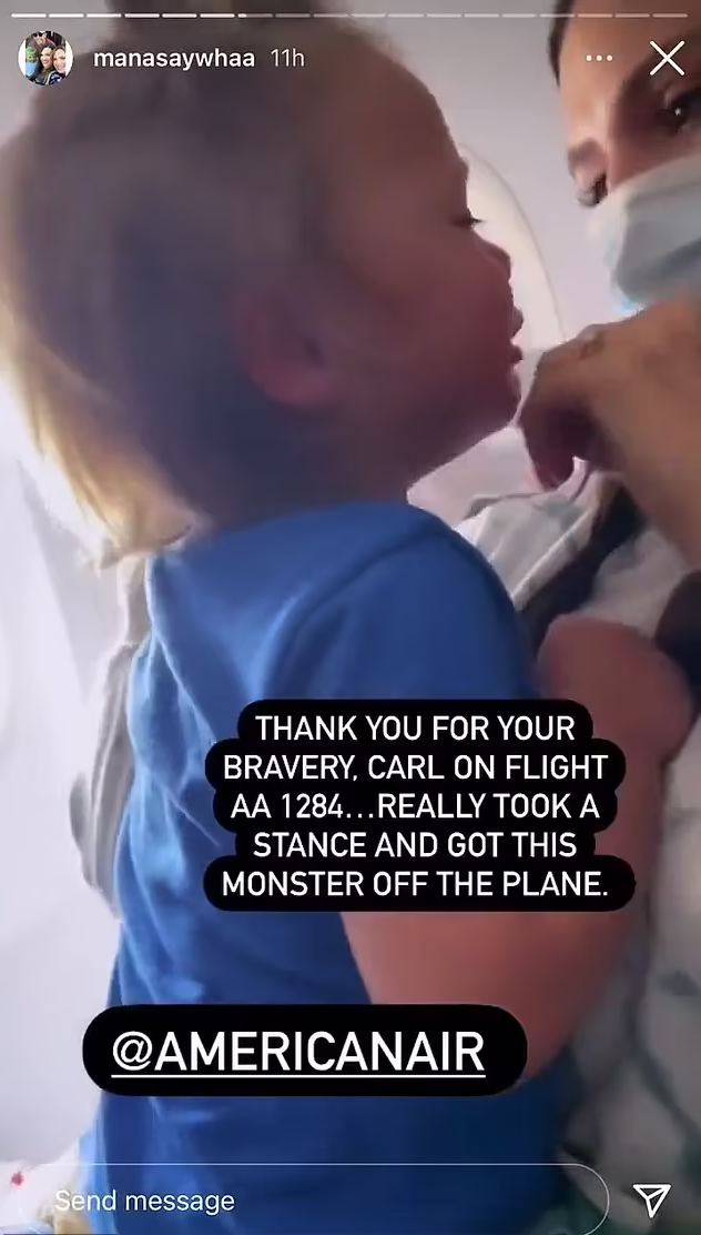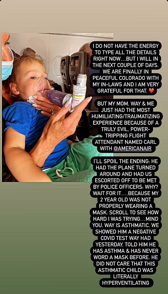 Video and photos on her IG story show her putting a mask over Waylon’s face and administering asthma medicine while they were on the flight.