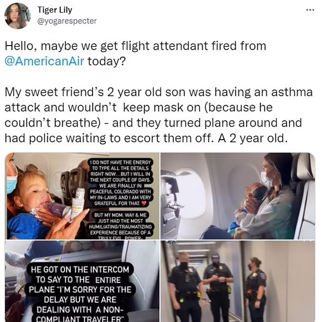 A mother claims she was booted out of an American Airlines flight because her son was unable to wear a mask as he was suffering an asthma attack.