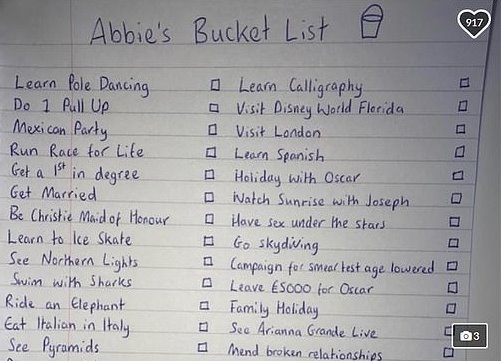 Abbie’s sister, Christie, set up a fundraising page for the 21-year-old and shared the bucket list her sister came up with.