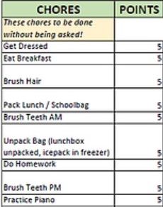 According to the mother’s chore chart, routine activities that she expects her children to do without being told to include dressing up, brushing hair, eating breakfast, brushing teeth, packing school bags, doing homework, unpacking school bags, and practicing piano.