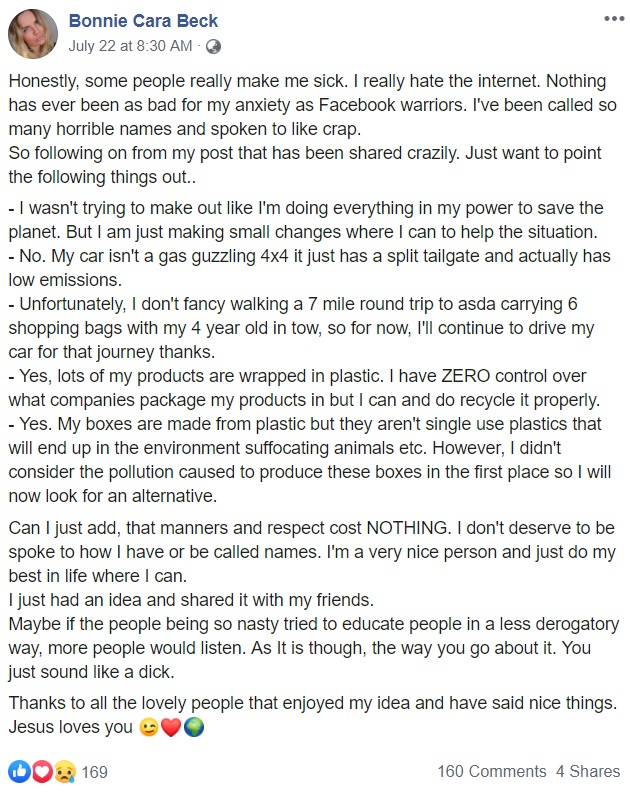 “Can I just add, that manners and respect cost NOTHING. I don’t deserve to be spoke[n] to how I have or be called names. I’m a very nice person and just do my best in life where I can. I just had an idea and shared it with my friends.”