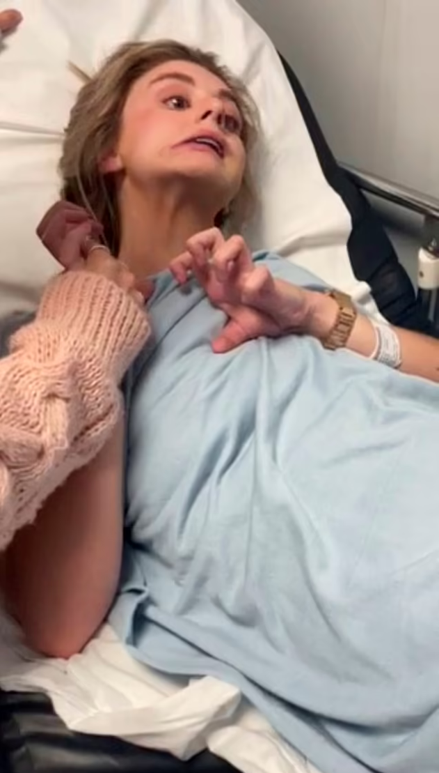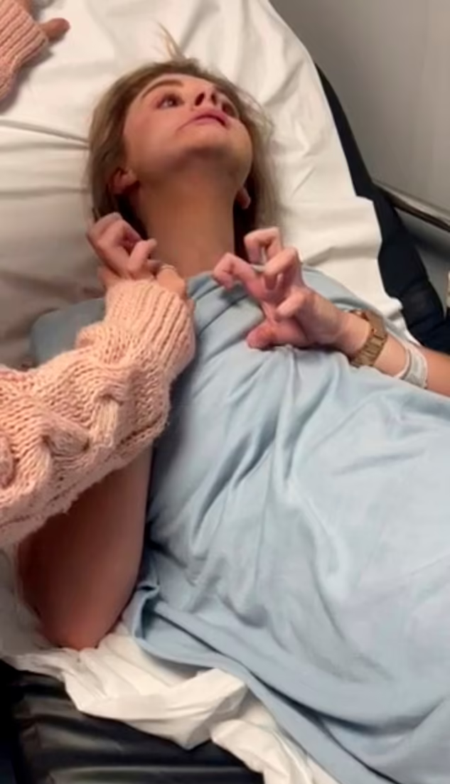 Millie Taplin, 18, looks in severe pain as her hands are bent inwards and her jaw is locked.