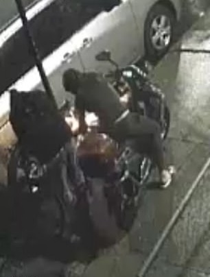In the short video, two people, who appear to be males, are seen attempting to steal a bike while on a motorcycle.