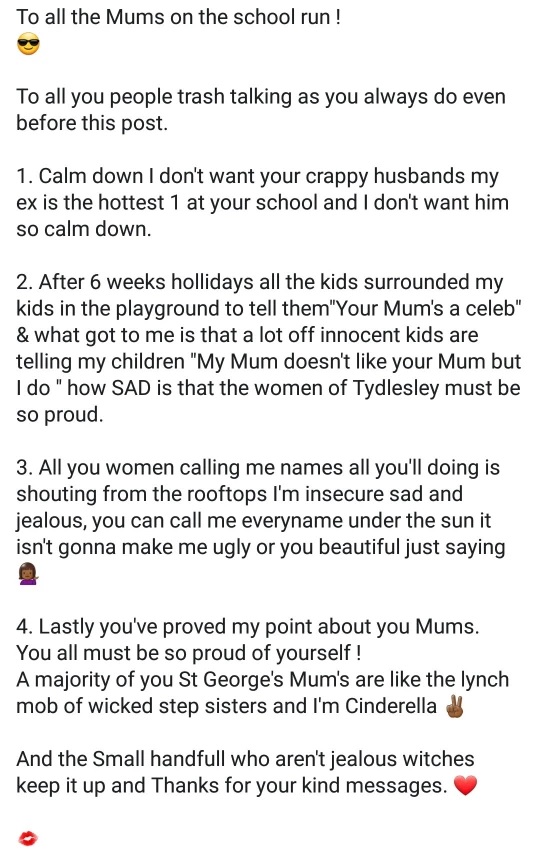 According to the upset mum, only a few other mothers greet her when they see her at the school, whereas others allegedly pull faces or stare at her.