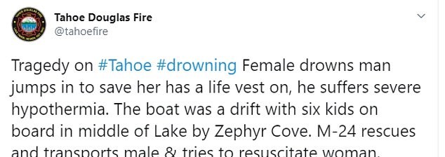 Tahoe Douglas Fire wrote on Twitter: “Tragedy on #Tahoe #drowning Female drowns man jumps in to save her has a life vest on, he suffers severe hypothermia.