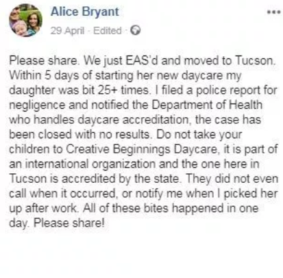 Alice shared a picture of her baby’s back and wrote how she found these marks on her body just after she joined the new nursery, Creative Beginnings Daycare in Tucson.