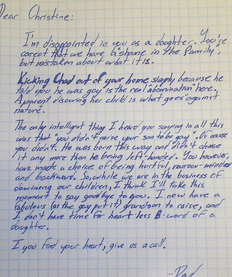 The letter from a grandfather to his heartless daughter, where he revealed the true meaning of unconditional love. After he told his mother, Christine of him being gay he receives unexpected results.