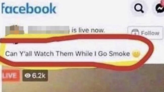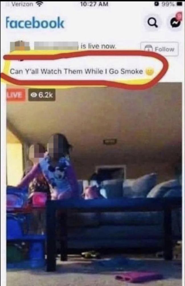“Can y’all watch them while I go smoke?” the mother captioned her live stream video in which the kids were seen seated on a couch in front of her laptop.