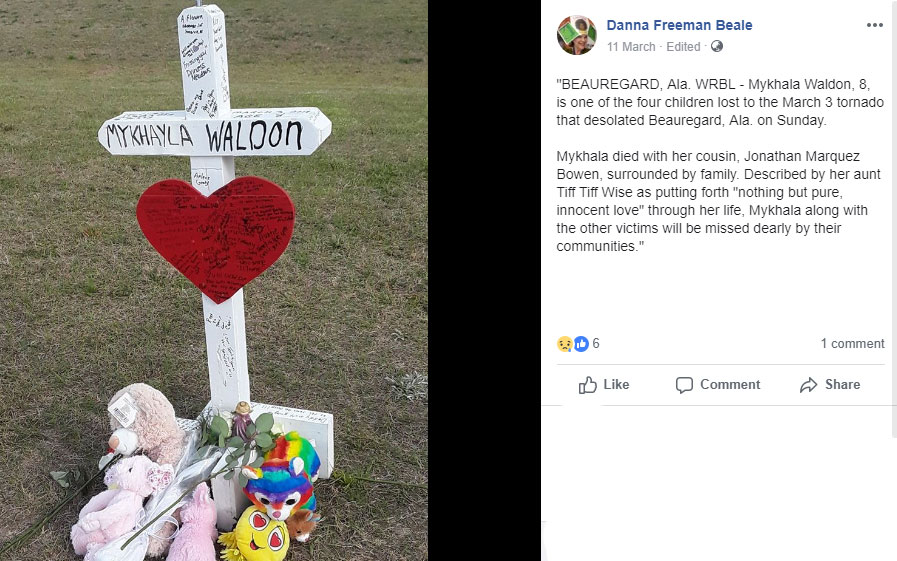 “The Tornado that hit Alabama has done more than destroy..it has disintegrated GENERATIONS,” a GoFundMe set up for the family reads. “Mykhayla Waldon IS IN HEAVEN, AT PEACE, WITH GOD BACK HOME, But her mother, father (Michael Waldon) and siblings will need support.”
