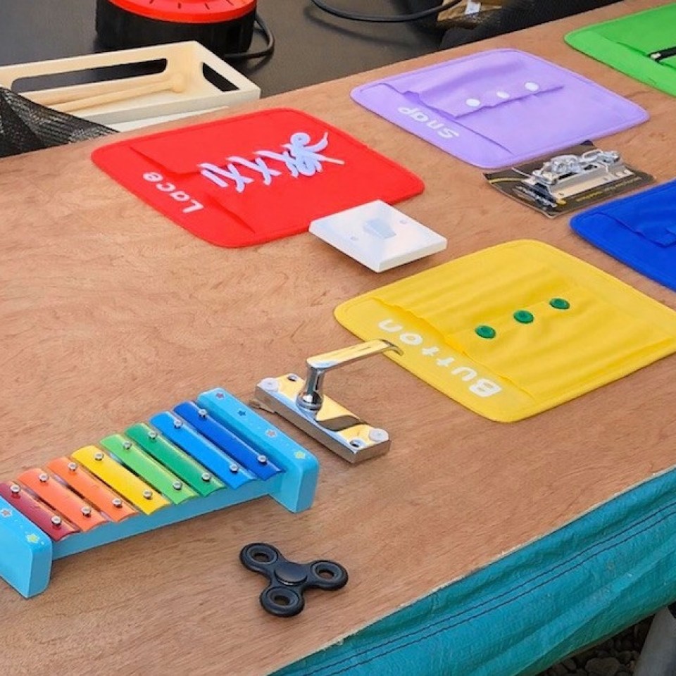 She didn’t choose any expensive pre-made board but collected some of her son’s favorite items along with some tactile objects like switches and handles.