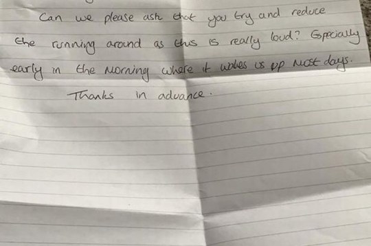 ‘‘Can we please ask that you try and reduce the running around as this is really loud. Especially early in the mornings where it wakes us up most days. Thanks in advance.’’