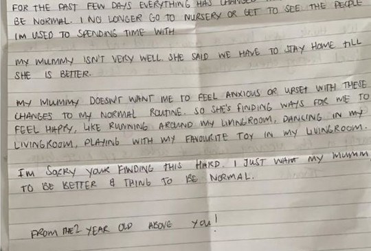 Lauren decided to write a letter back in the name of her son Leo. She wrote, ‘’I no longer go to nursery or get to see the people I’m used to spending time with. My mommy isn’t very well, she said we have to stay home ’til she is better.’’
