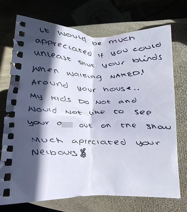 “It would be much appreciated if you could unleast shut your blinds when walking naked! Around your house… my kids do not and would not want to see your a** out on the show. Much appreciated, your neibours,” the note read.