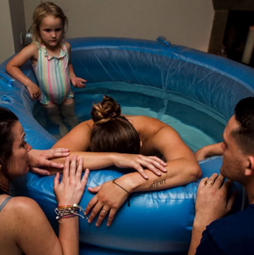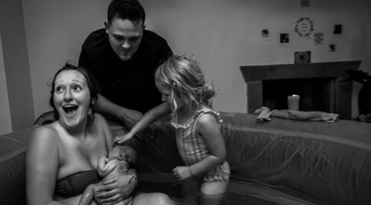 Once she got herself into the birthing pool her daughter followed her in as well. The youngster was wearing her swimsuit and stood by her mother until her little brother presented himself to the world.