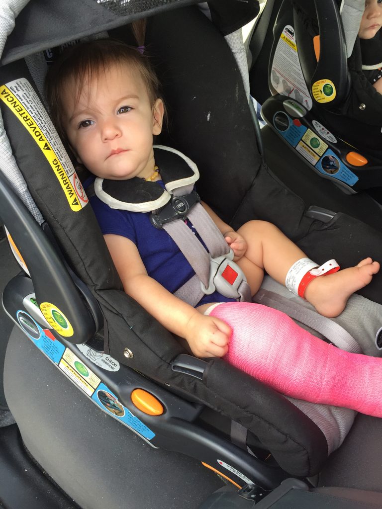 “So every year I do a PSA on going down a slide with your child on your lap. When Meadow was 12 months old (I went down with Matthew first, but he was lucky), I went down the slide with her on my lap, and her foot got caught between me and the slide. This picture is the moment her leg was breaking. She’s still smiling… because it was happening at this exact moment.”