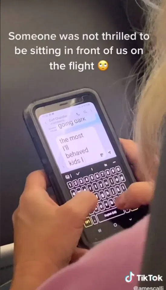 In the viral TikTok video, a woman is seen typing a message that initially read “the most ill-behaved brats I have ever seen on a plane” before she changed ‘brats’ to ‘kids.’