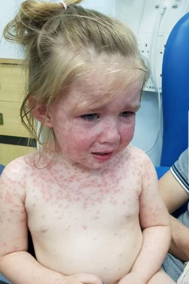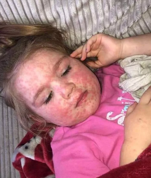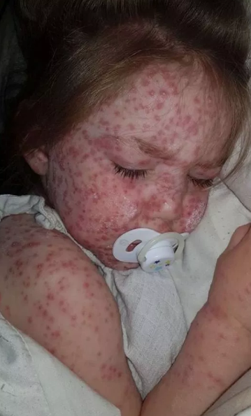 The next day, the 2-year-old’s entire body was covered with red spots that had already spread inside her mouth and throat.