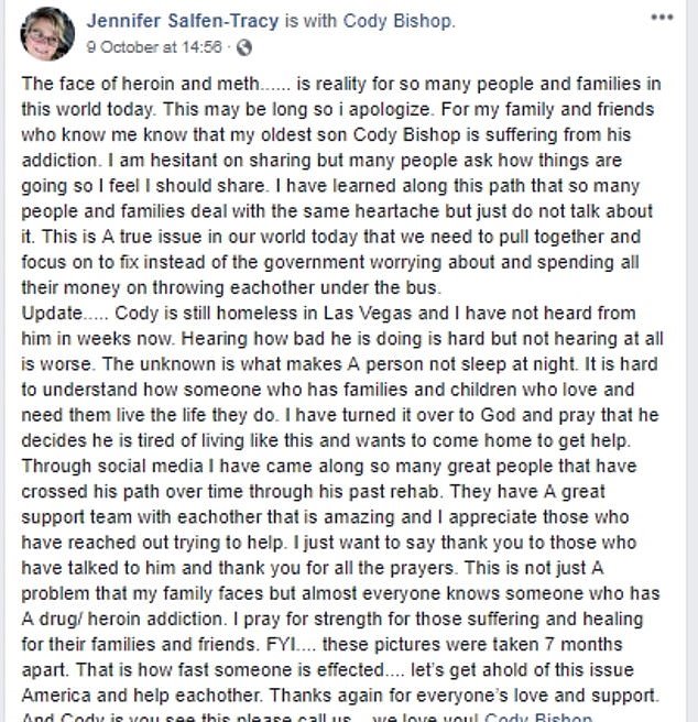 “For my family and friends who know me know that my oldest son Cody Bishop is suffering from his addiction. I am hesitant on sharing but many people ask how things are going so I feel I should share.