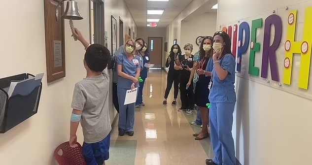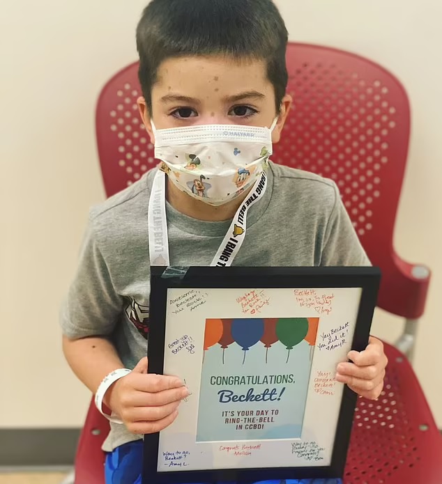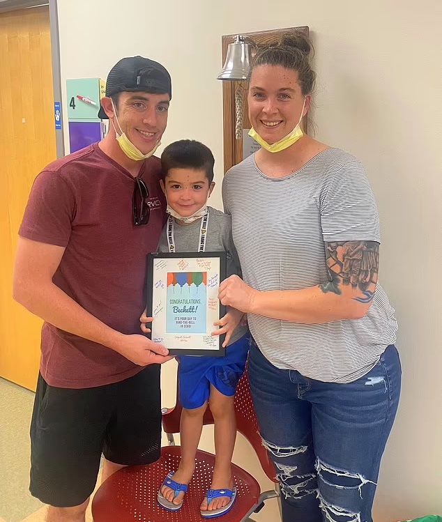 The mother also proudly shared a video in which the young boy is seen ringing a bell in his hospital to mark the end of chemotherapy and the beginning of a new chapter.