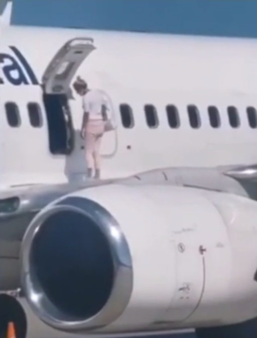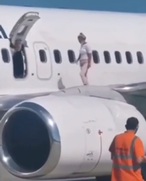 A mother was caught on camera walking on the wing of a Boeing 737 plane after opening the emergency exit “to get some air.