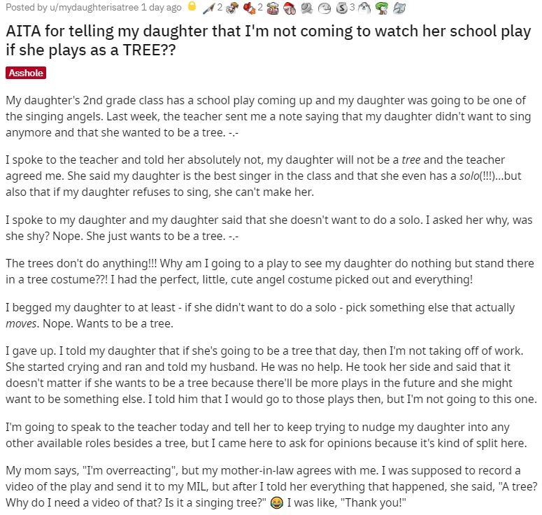 A mother has taken to Reddit to ask users if she was an a**hole for refusing to see her daughter’s school play because the 7-year-old wanted to be cast as a tree.