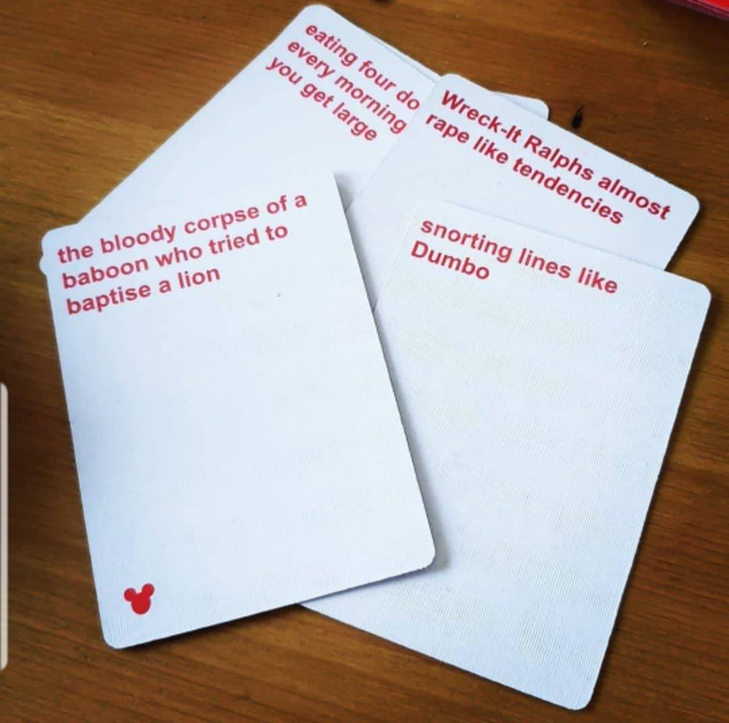 According to the game’s description, one should come up with the most disgusting phrases possible by combining different Disney-themed cards.