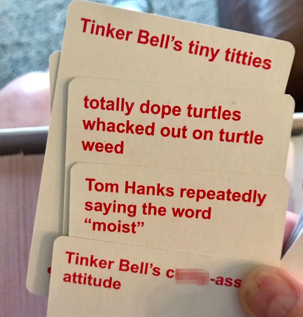Naturally, the mother wasn’t too thrilled when she found out the cards contained phrases such as ‘Tinkerbell’s titties,’ ‘making Pinocchio lie while he’s eating you out,’ and ‘Li Shang’s micropenis.’