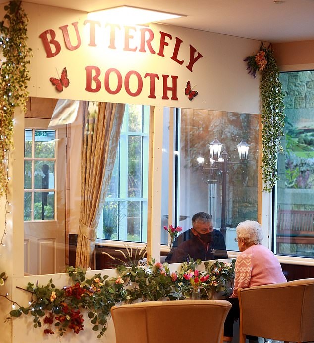 Fortunately, the home for the aged recently installed a special visiting booth with a big glass screen through which visitors can see their family members.