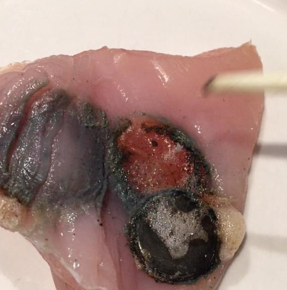 The CPR kids founder left one button battery on the chicken fillet to see the effect that it leaves after coming in contact with the flesh. After checking it every 30 minutes, the different outcomes were described.