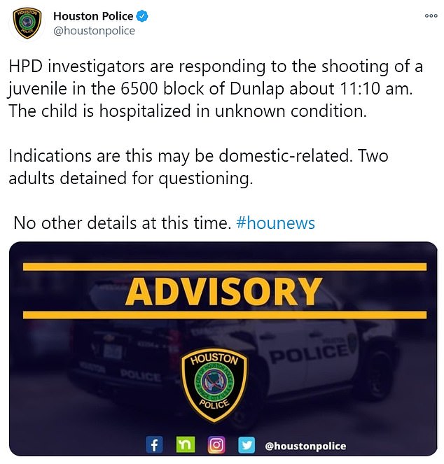 “HPD investigators are responding to the shooting of a juvenile in the 6500 block of Dunlap about 11:10 am. The child is hospitalized in unknown condition,” Houston Police wrote on Twitter.