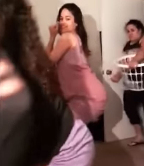 In the footage, two teenage girls trying to twerk in front of a webcam with Spanish music playing in the background. Then their mom walks into the room with a washing basket, removes one of her slippers and uses it to smack the girls across the back.