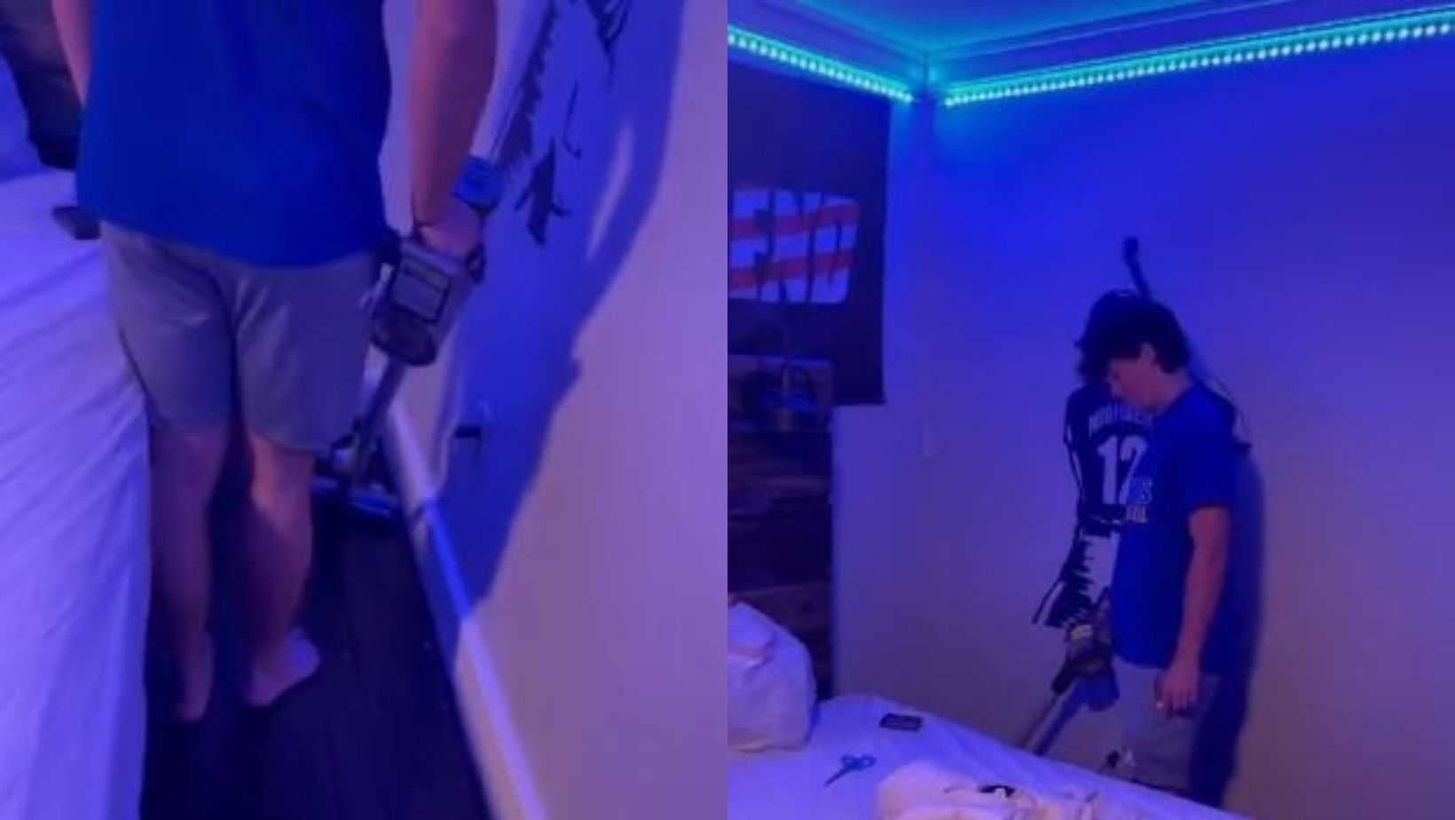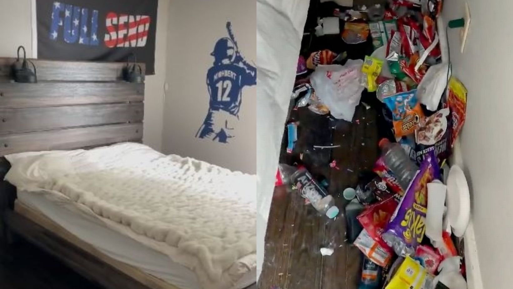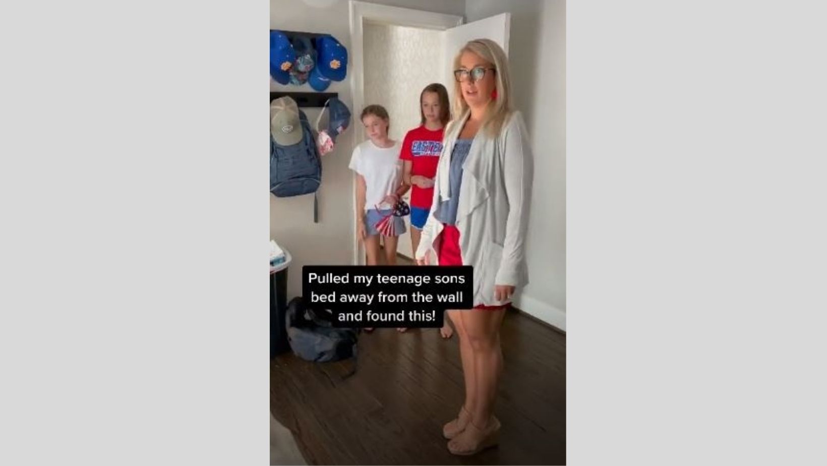 “Pulled my teenage son’s bed away from the wall and found this!” the caption in the video reads.