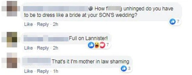 “How f*****g unhinged do you have to be to dress like a bride at your SON’S wedding?” one commenter wrote.