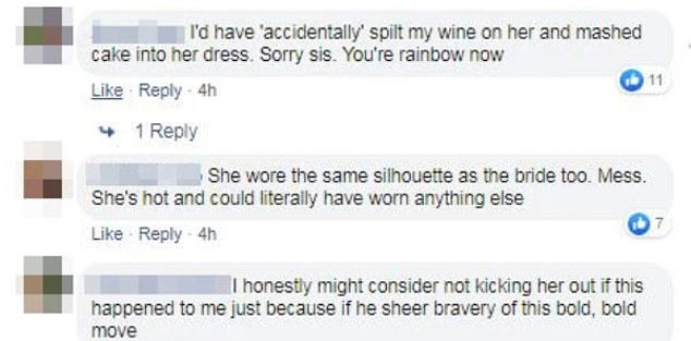 One woman suggested: “I’d have ‘accidentally’ spilled my wine on her and mashed cake into her dress. Sorry, sis. You’re rainbow now.”