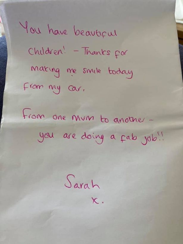 The note, written by a woman named Sarah, reads: “You have beautiful children! – Thanks for making me smile from my car.