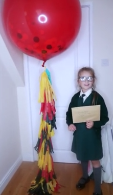 As she entered, they gave her a handwritten letter and there was a huge red balloon in the room.