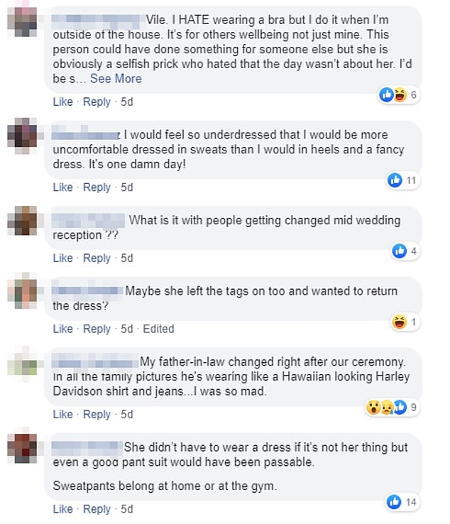 “My mother did the same thing, changed right after the ceremony,” someone claimed in their comment. “I didn’t get any good pictures of her in the pretty dress I helped pick out but plenty of her in a purple Vikings sweatsuit.”