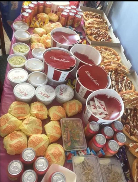 The photo shows a mountain of greasy food, including KFC buckets, McDonald’s cheeseburgers, pizza drenched in sauce and fizzy drinks.