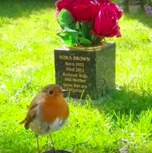 She went there carrying some flowers with her and while sitting on a bench in front of the grave, she started thinking of the good times when Jack was alive. Tears started coming down her eyes. It was that moment when she saw a robin sat down on the grave’s plate looking towards her.