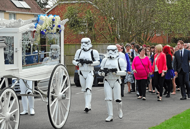 Jack was also given an elaborate Star Wars-themed funeral and his body was being carried in a Star Wars theme coffin while people were standing on both sides of the road as the Stormtroopers walked along with the coffin.