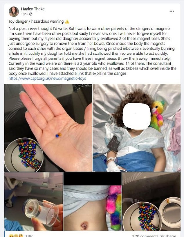 Hayley Thake took to Facebook to warn other parents about the dangers of magnet toys that burned holes in her daughter’s intestines and bowels.