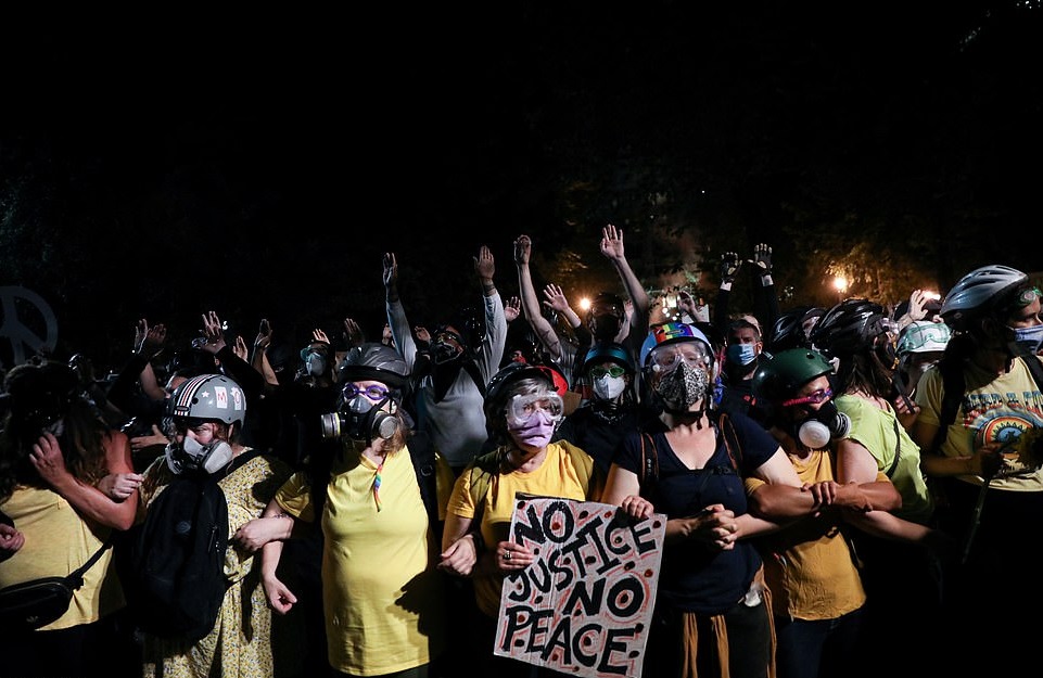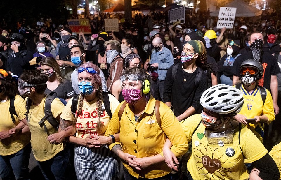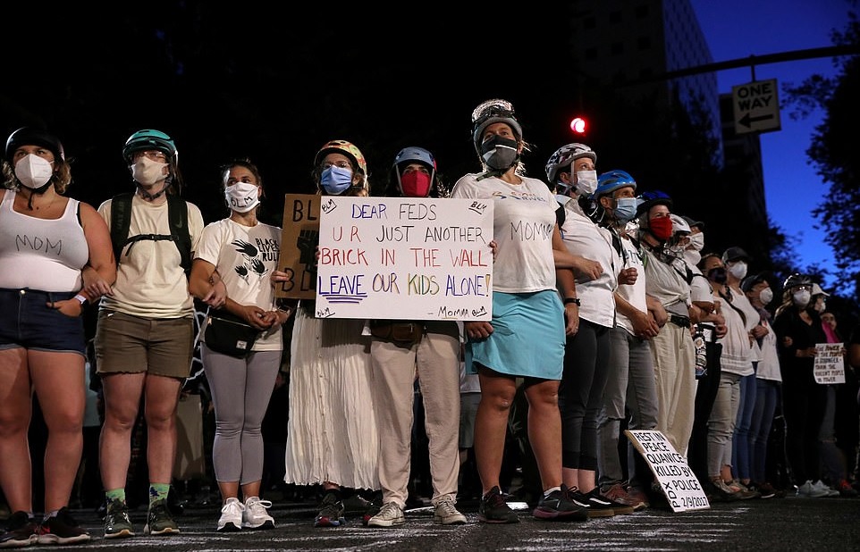 On Saturday, following more than 50 nights of Black Lives Matter protests in the state’s largest city, a group of mothers formed a human chain dubbed the ‘Wall of Moms’ in an attempt to stop federal officers from getting to the protesters.